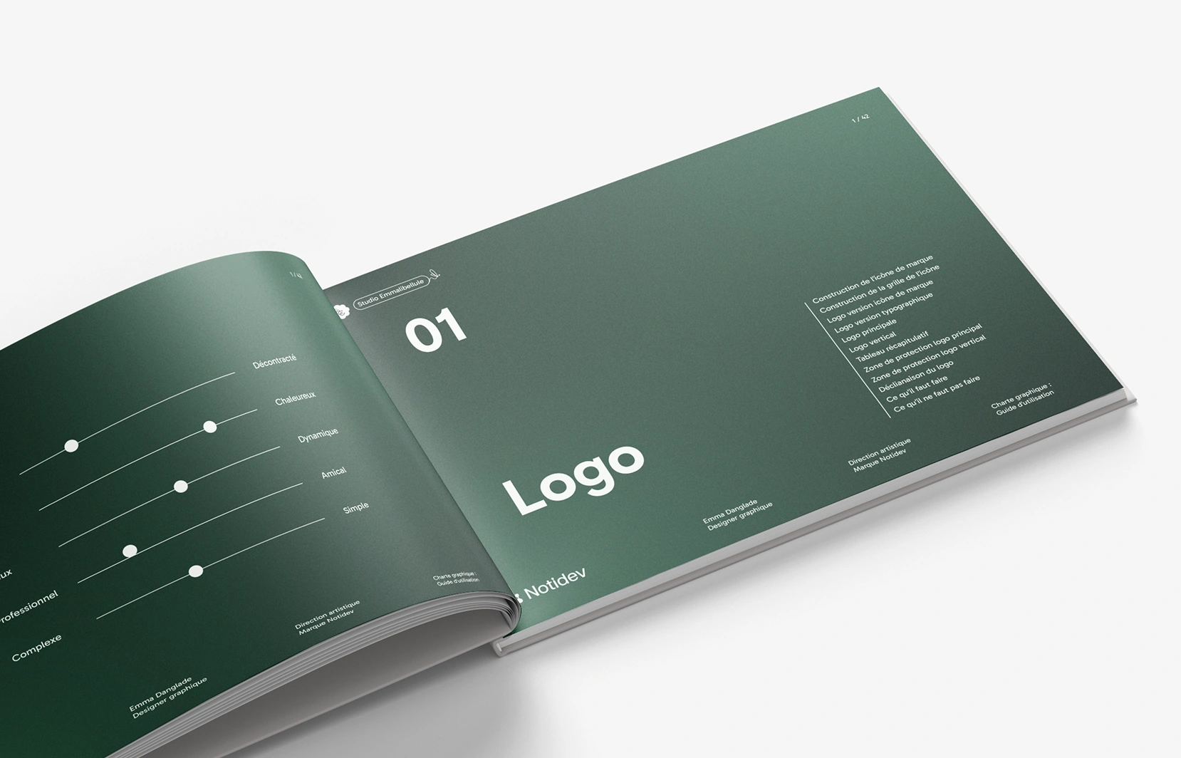 La direction artistique de Notidev s'ancre dans un univers tech minimaliste et fluide, avec un logo inspiré des réseaux neuronaux, une palette de verts dynamiques et un pattern géométrique évoquant la trame de neurones. Les dégradés et effets de glassmorphisme apportent mouvement et profondeur, en écho à la circulation des données et aux systèmes intelligents. La typographie Articulat, utilisée dans différentes graisses, renforce une image claire, structurée et professionnelle, en phase avec des solutions IA sur mesure et pédagogiques.
