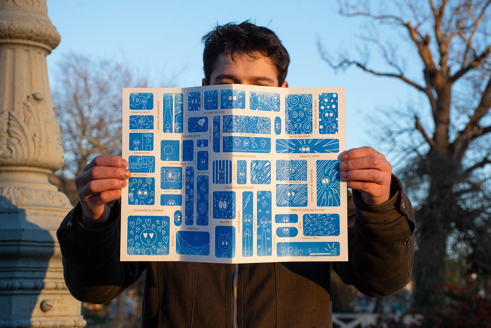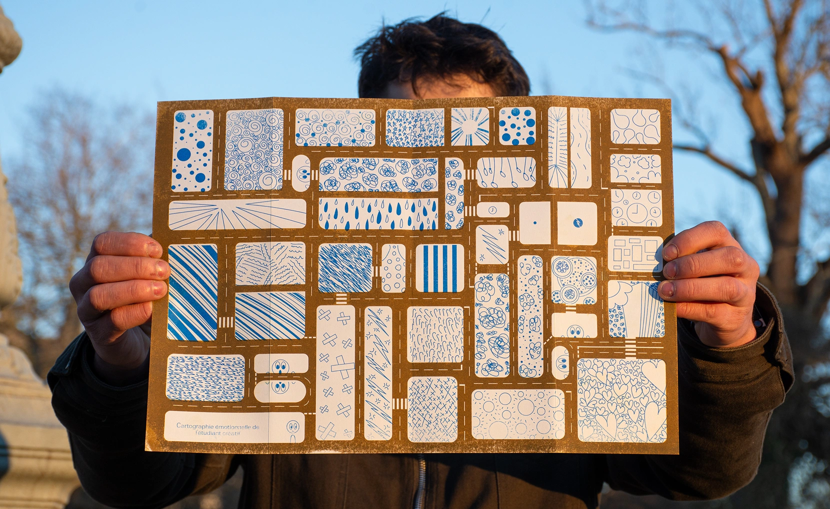 Recto-verso narratif où forme et manipulation dialoguent : au recto, un plan de ville dont chaque rue porte une émotion compose la géographie sensible du parcours étudiant ; au verso, une trame miroir prolonge la lecture en deux temps. Pliage façon carte routière invitant au « voyage » intérieur. Résultat : concept abstrait traduit en système visuel cohérent, évocateur et immersif.