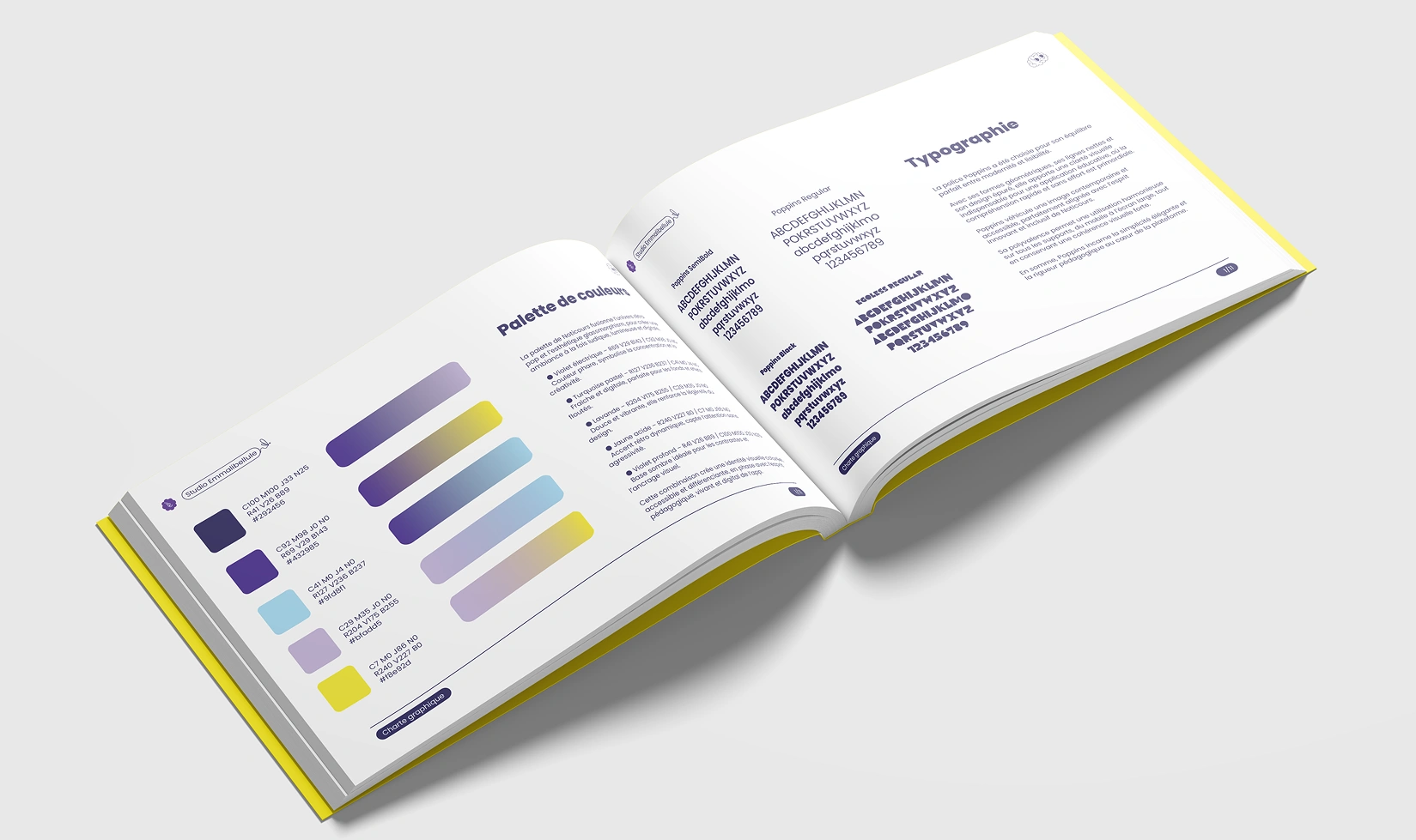 Identité visuelle inspirée du style rétro-glassmorphisme, associant pédagogie et modernité. Le logo, un cerveau déclinable, symbolise l'accompagnement de l'utilisateur dans son apprentissage. Palette vibrante (violet électrique, turquoise pastel, lavande, jaune acide) et typographie Poppins assurent clarté et cohérence. Résultat : une image fraîche, accessible et différenciante, au service d'un savoir vivant et engageant.