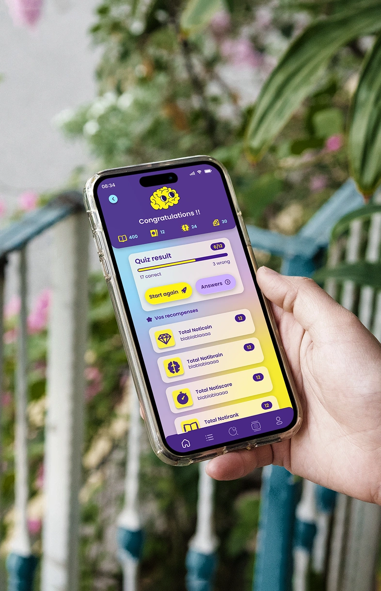 Interface fluide où l'UX structure navigation et hiérarchie pour une prise en main immédiate, tandis que l'UI traduit cette logique en une esthétique claire et moderne. La gamification (mascotte, pictogrammes, récompenses) stimule la motivation et fait de l'apprentissage une expérience accessible, dynamique et interactive, à la croisée de la rigueur pédagogique et de l'innovation visuelle.