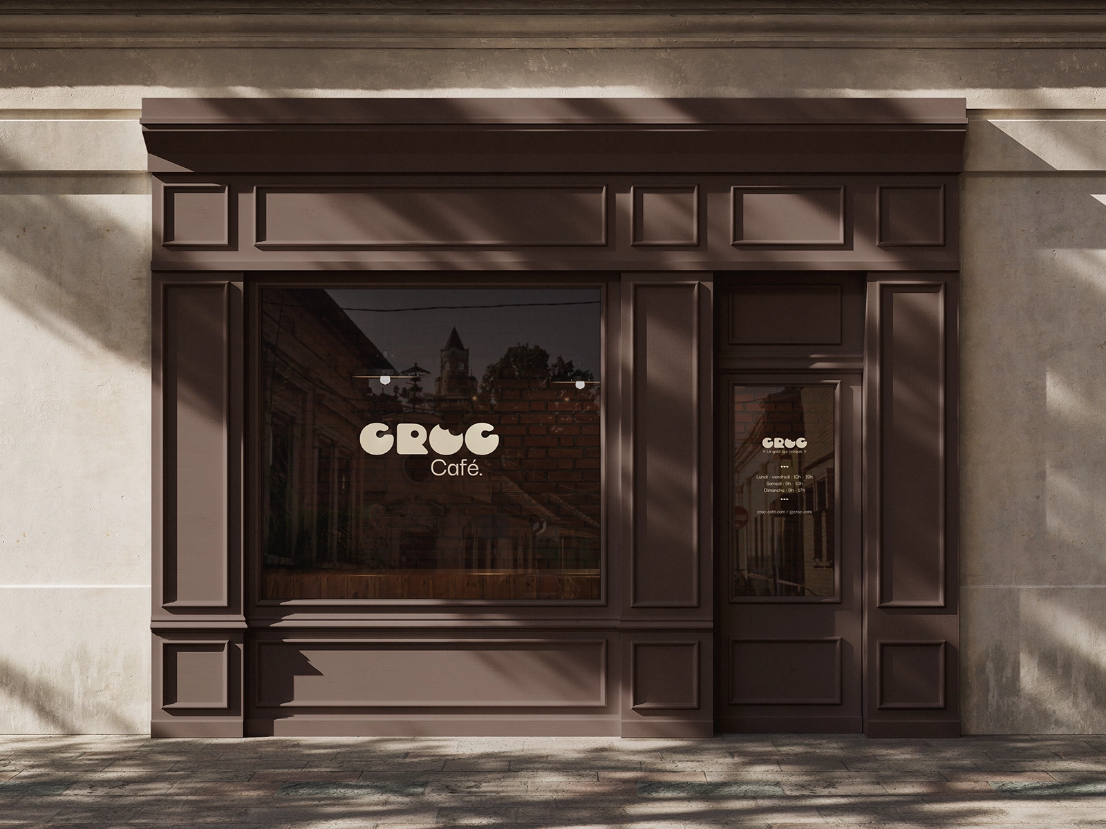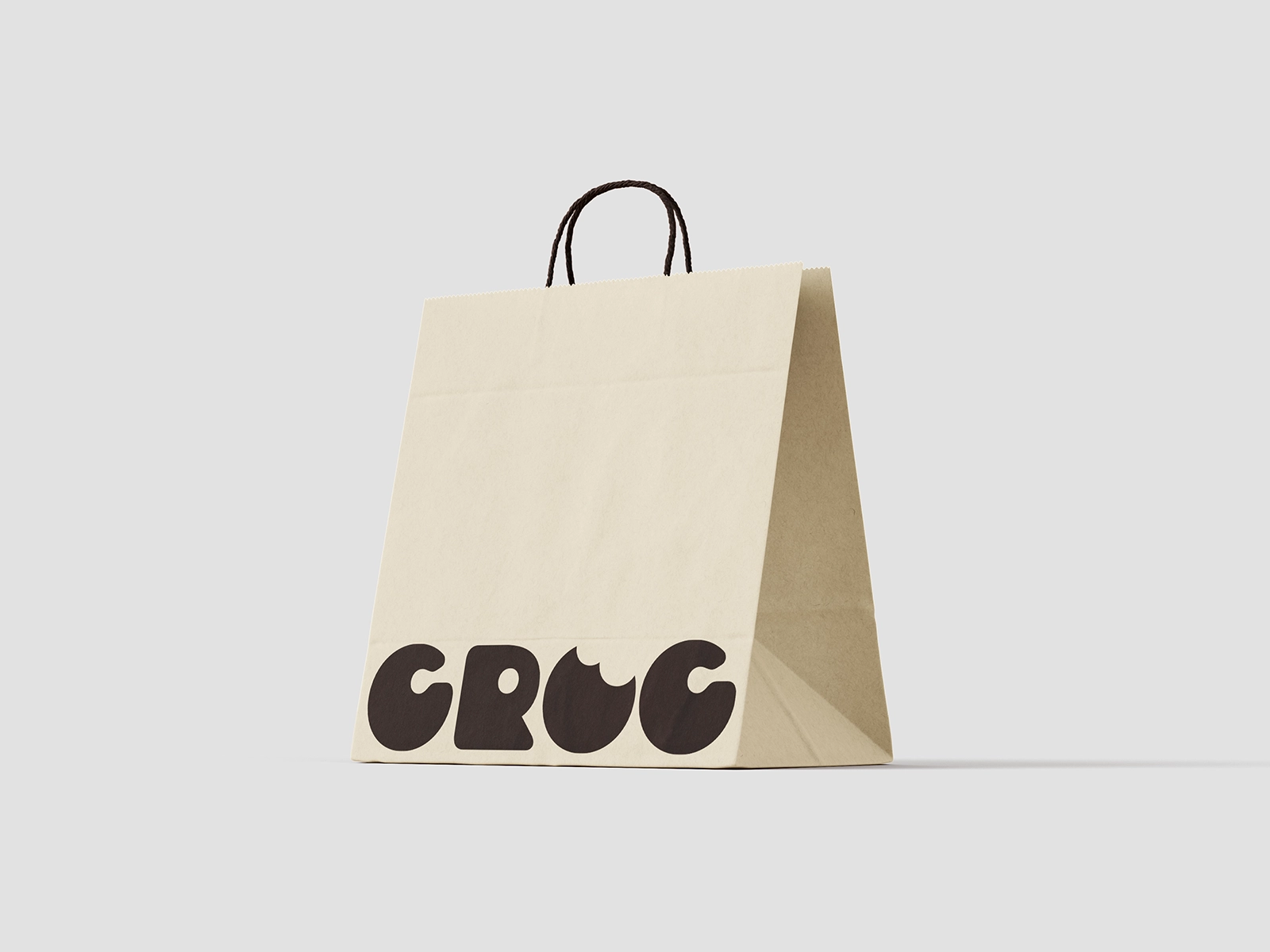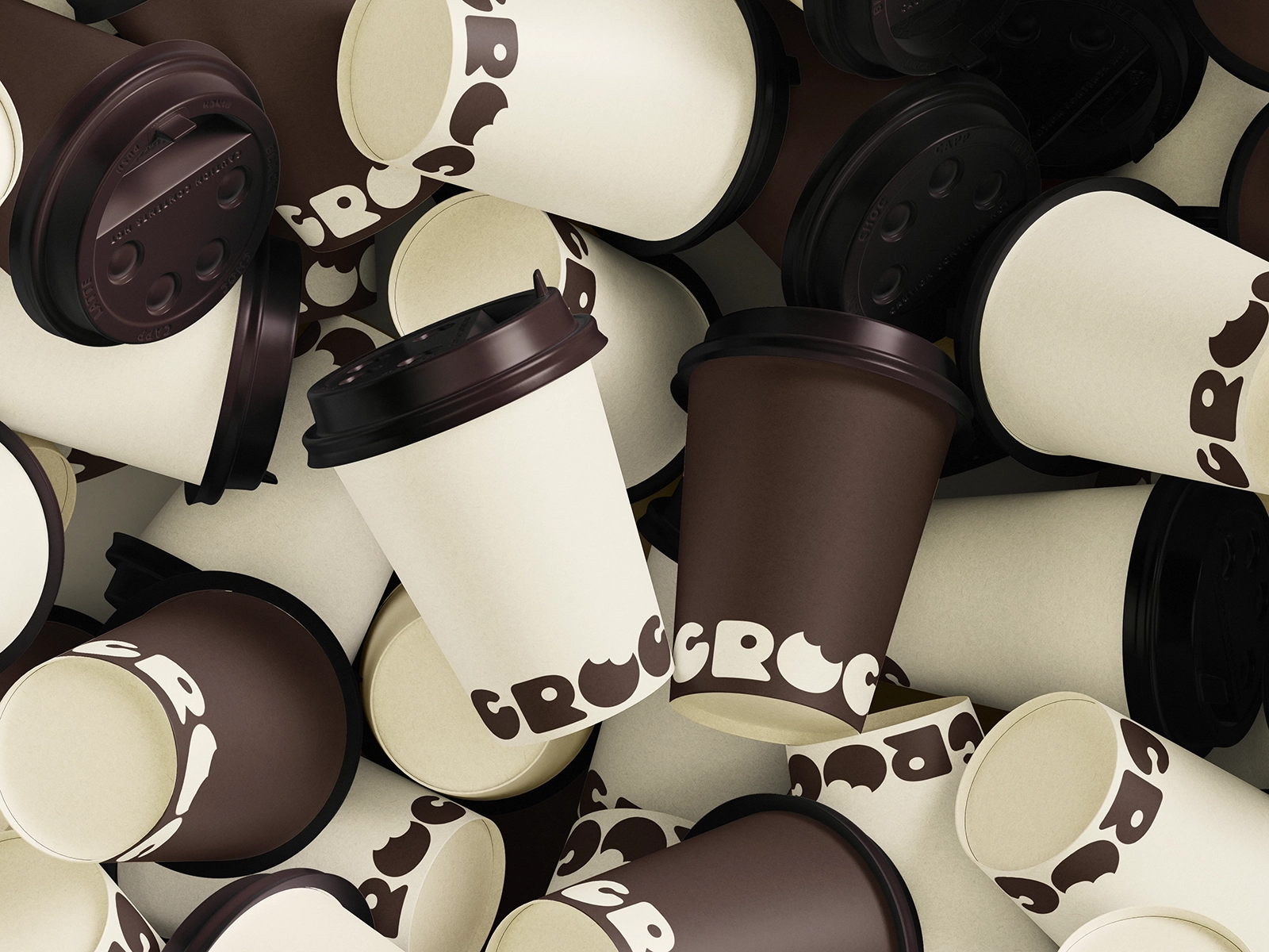 Identité visuelle pour Croc Café, café fictif rétro-gourmand autour du claim « Le goût qui croque. » : système graphique construit sur une typographie de logo Droog mordue, une palette profonde crème/brun et un vocabulaire de formes croquées pour incarner la générosité et la texture. Déclinaisons sur gobelets, sacs kraft, vitrine, carte, carte de visite, panneau extérieur pour créer un univers cohérent, chaleureux et mémorable, qui valorise l'expérience de pause café comme moment à croquer.