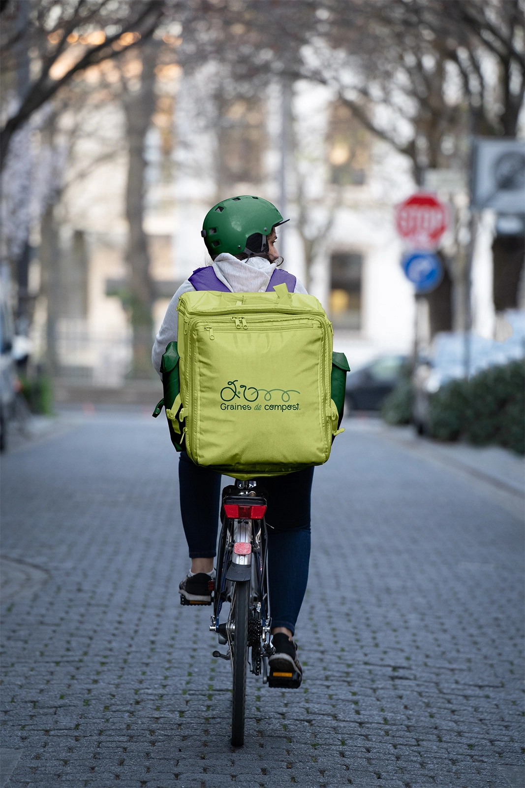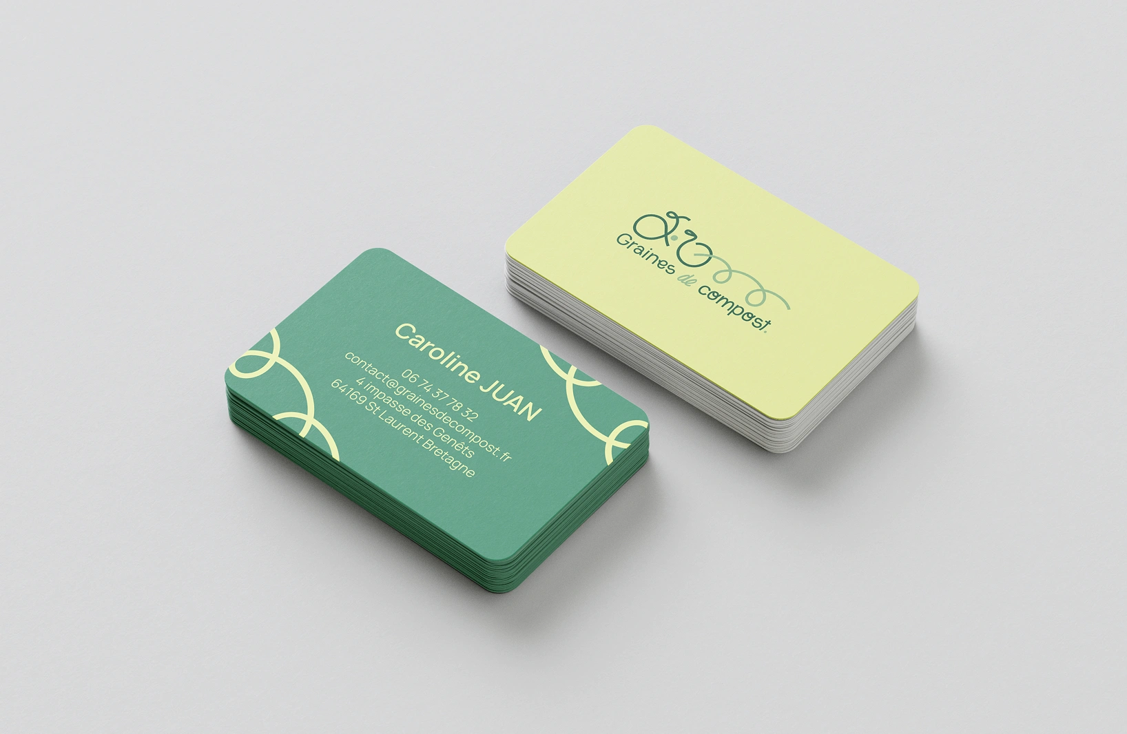 Identité visuelle "one line" où un trait continu esquisse le vélo-cargo et se prolonge dans le logotype : les lettres suivent le tracé d'un trajet A→B, matérialisant collecte, déplacement et valorisation. Résultat : un système minimal et dynamique, immédiatement mémorisable, qui raconte l'histoire de Graines de Compost et s'adapte naturellement à tous les supports.