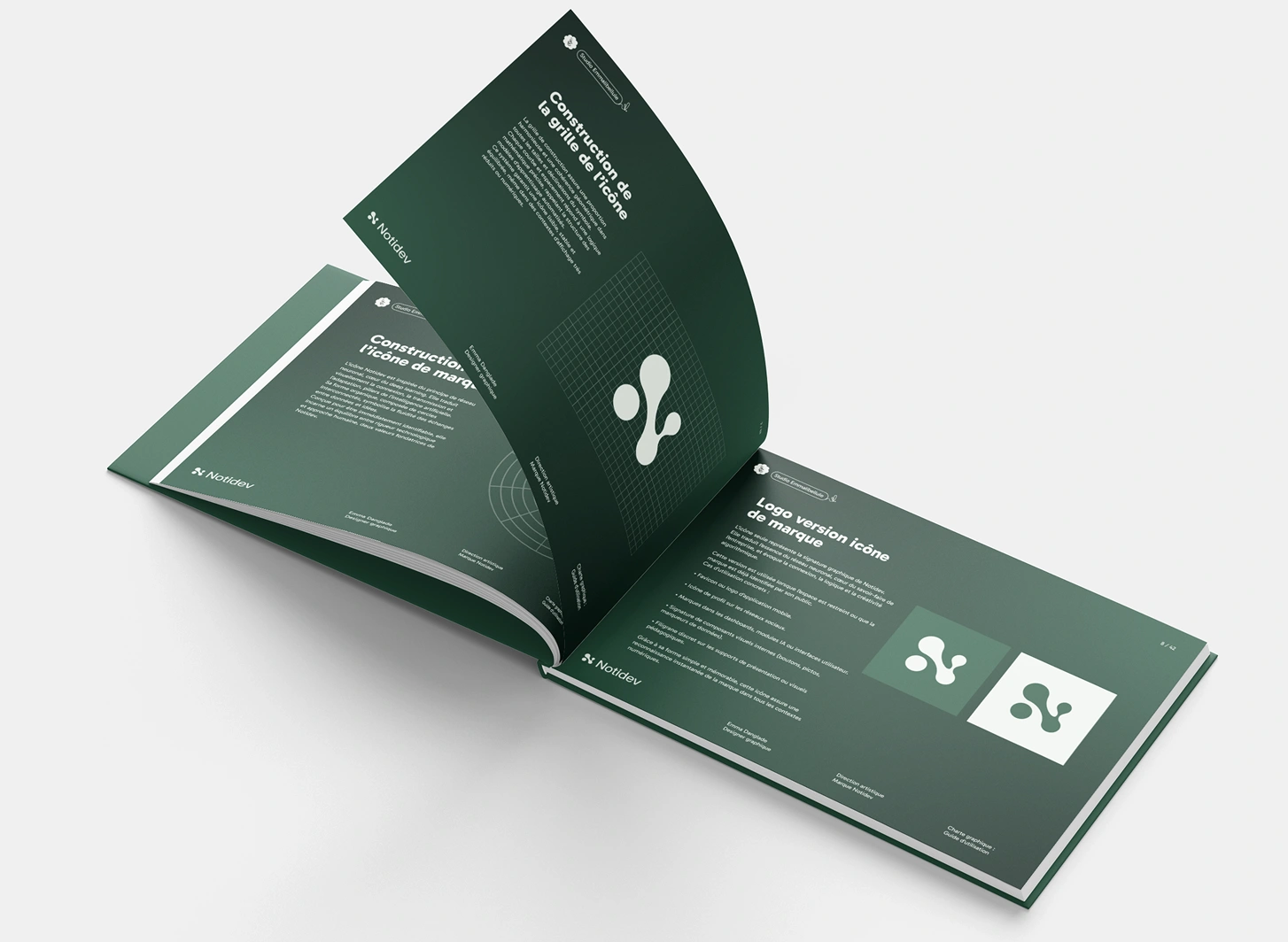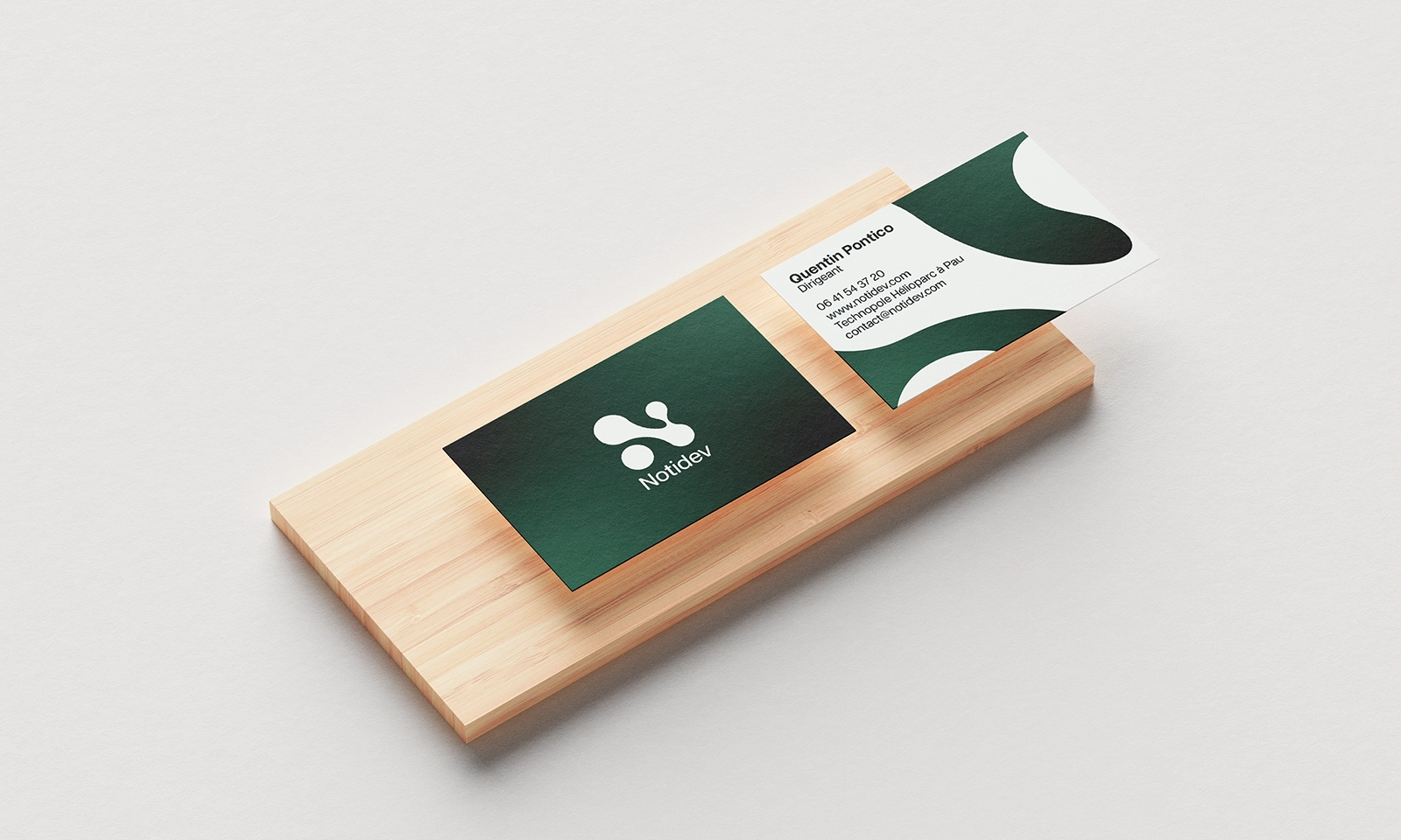 La direction artistique de Notidev s'ancre dans un univers tech minimaliste et fluide, avec un logo inspiré des réseaux neuronaux, une palette de verts dynamiques et un pattern géométrique évoquant la trame de neurones. Les dégradés et effets de glassmorphisme apportent mouvement et profondeur, en écho à la circulation des données et aux systèmes intelligents. La typographie Articulat, utilisée dans différentes graisses, renforce une image claire, structurée et professionnelle, en phase avec des solutions IA sur mesure et pédagogiques.